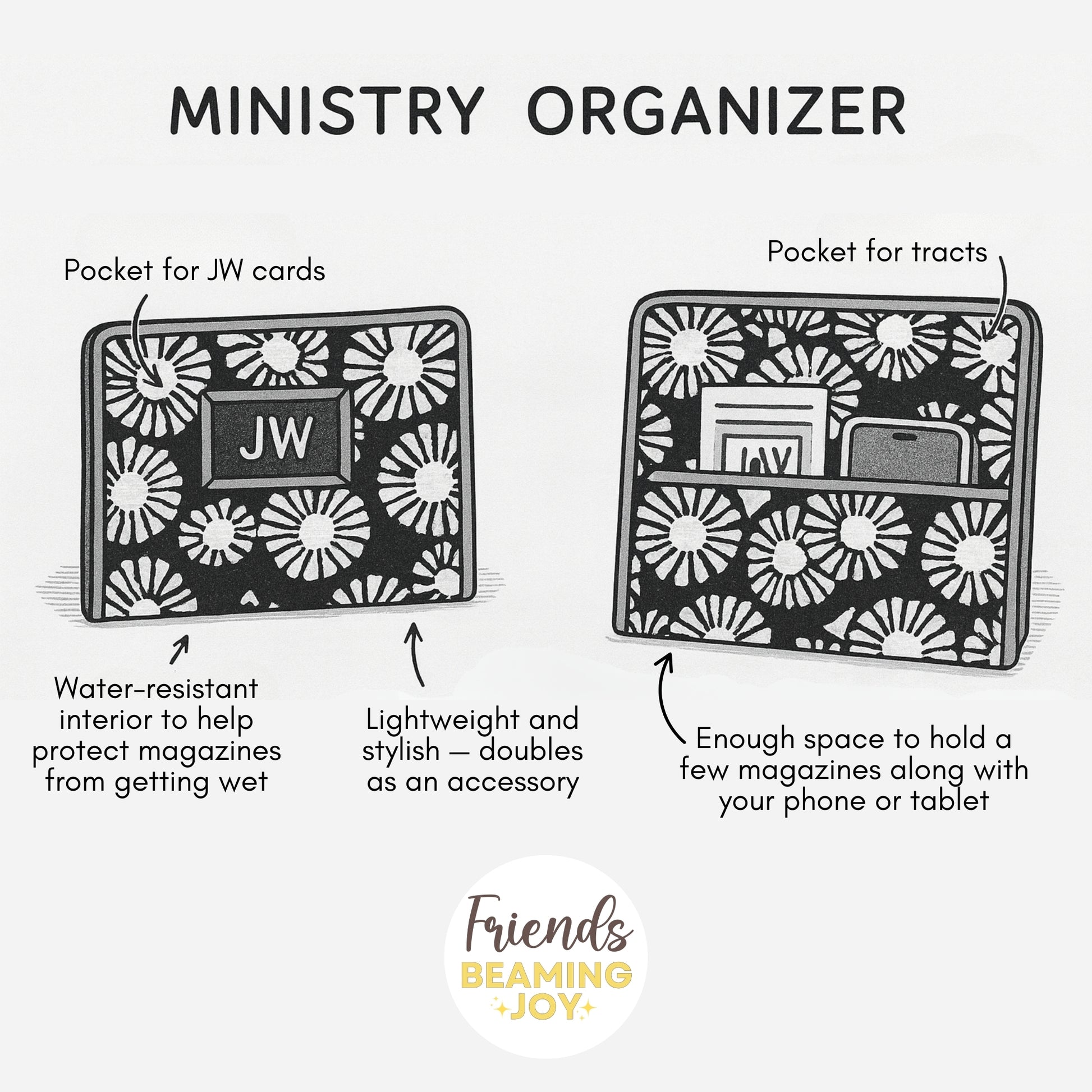 Designed to hold your tracts, magazines, invitations and mobile devices, this lightweight ministry organizer features Indian block print pattern with a peek-through JW card window and a jouful lining inside. Water-resistant interior to help protect magazines from getting wet.