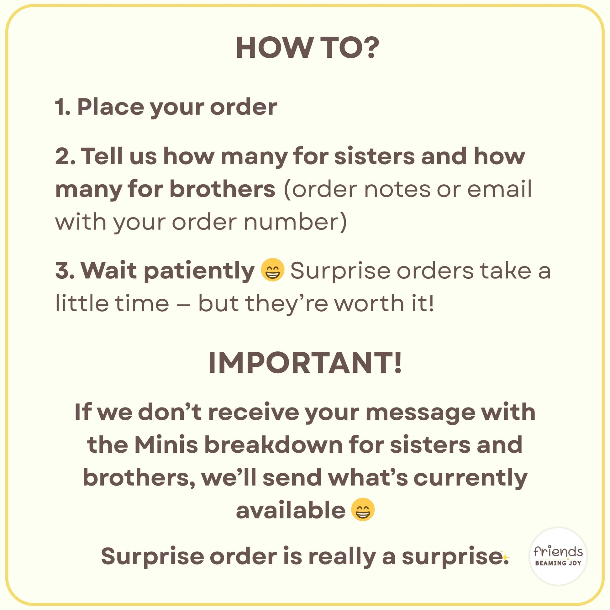 PLEASE READ CAREFULLY! If you’d like a set number of Minis for brothers and sisters and you’re flexible with the colors and styles, you can place a surprise pre-order.